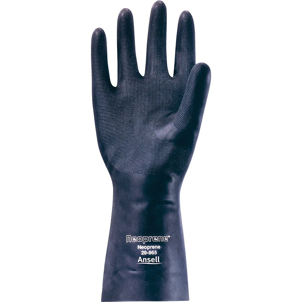 Flock-lined unsupported neoprene. Increase chemical and abrasion resistance over standard neoprene gloves. Broad-spectrum protection. Excellent resistance to a wide range of chemicals, including oils, acids, caustics and solvents. Accepted for use in Canadian food processing facilities; Applications: Petrochemicals, degreasing, electronics, refining, handling oils, acids, caustics, alcohols and solvents.